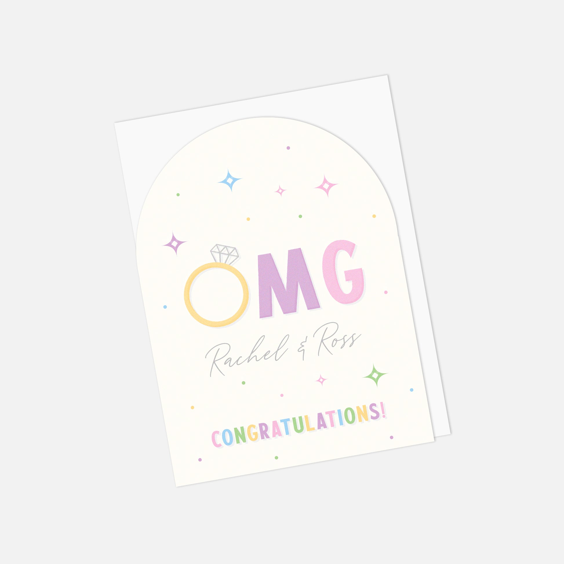 Celebrate the exciting news with this vibrant and playful engagement card! Featuring the phrase “OMG” with a diamond ring illustration and a soft pastel background, it’s the perfect way to say congratulations to the happy couple.