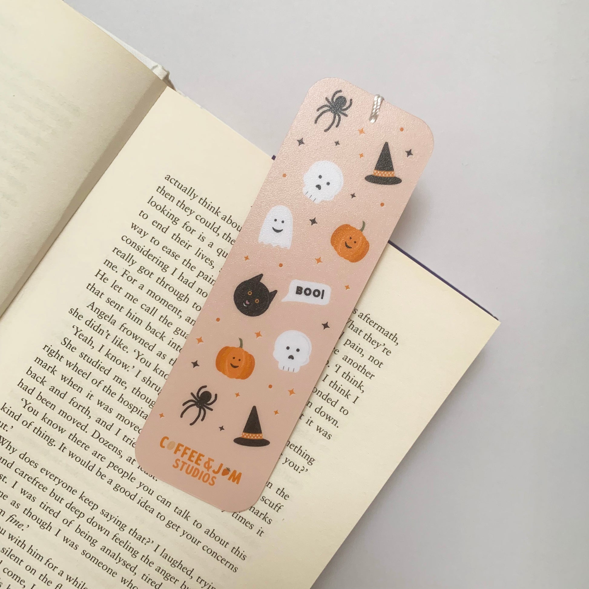 Add a little spooky sweetness to your reading with this pastel Halloween bookmark! Featuring friendly ghosts, cheerful pumpkins, black cats, witches’ hats, bats, and spiders – all set against a soft peachy-pink background – this design is frightfully adorable. Finished with a matte coating and a white tassel for that extra touch of charm, it’s perfect for getting into the Halloween spirit, no matter the season.