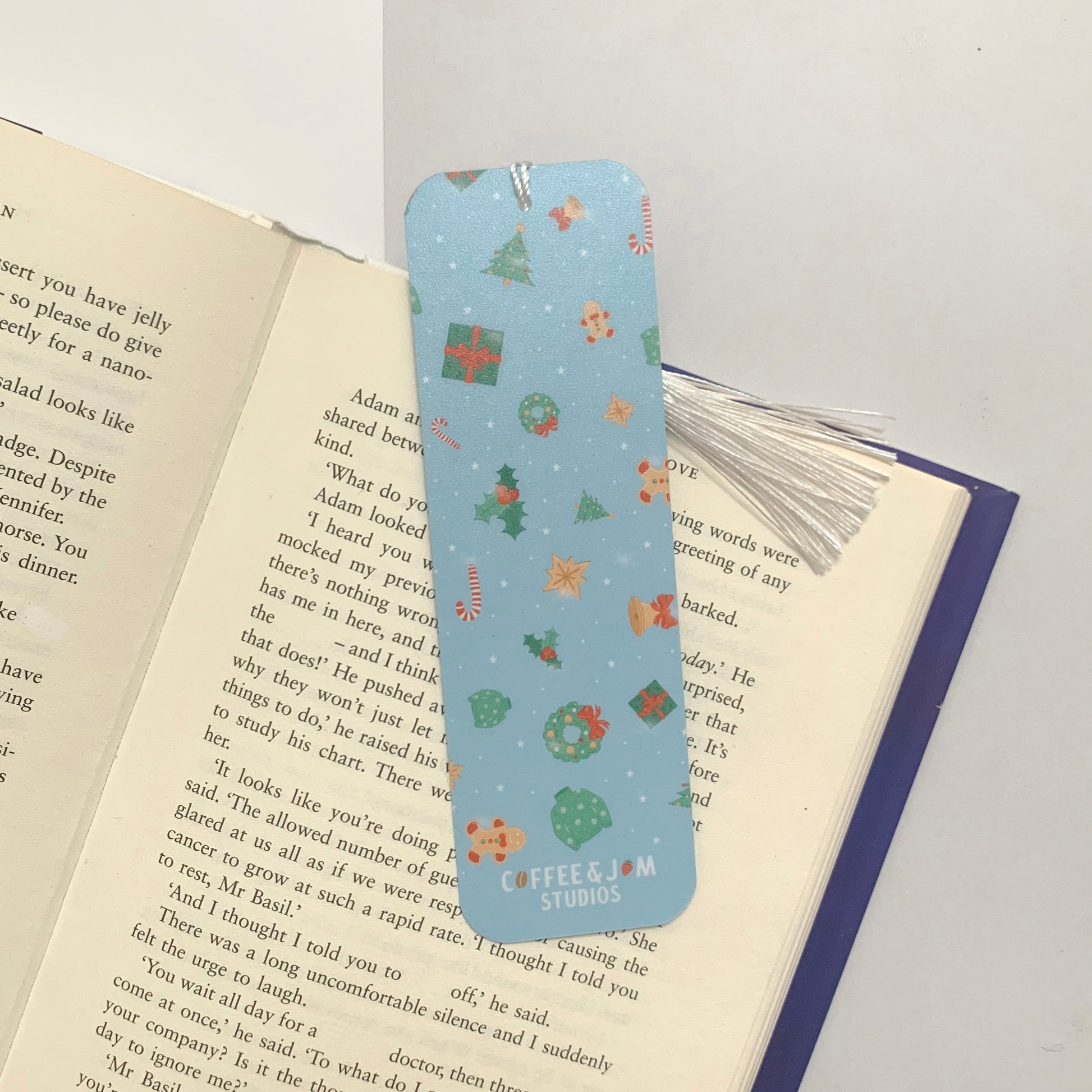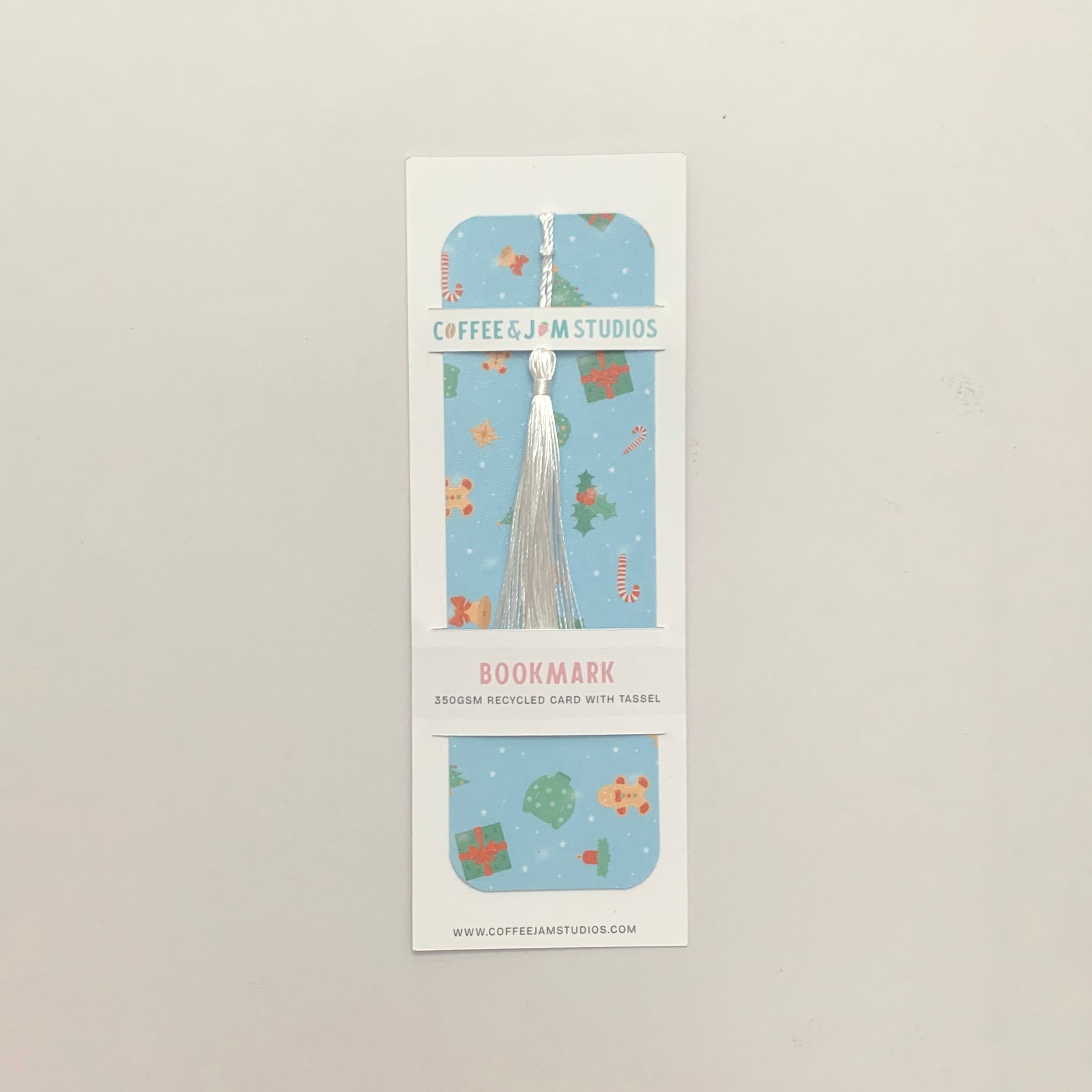Mark your pages in festive style with our Blue Christmas Bookmark! Featuring a cheerful pastel blue background sprinkled with Christmas icons — from trees and wreaths to gingerbread, candy canes, gifts, and more — this bookmark is topped with a silky white tassel, making it both practical and seasonal.