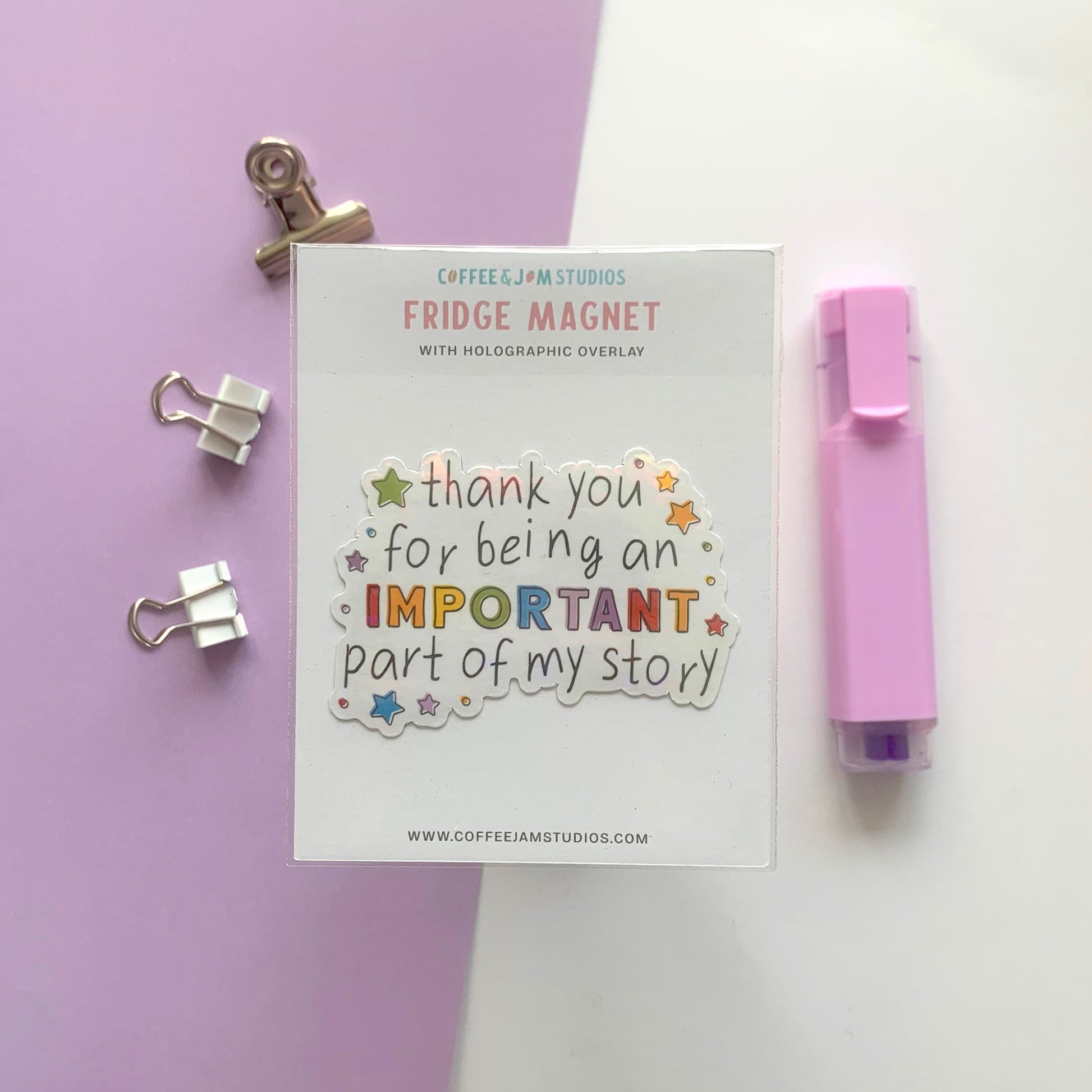 Brighten someone’s day with this charming die cut fridge magnet! Featuring the heartfelt message "thank you for being an IMPORTANT part of my story", this magnet is a lovely token of appreciation for teachers, friends, colleagues, or loved ones.