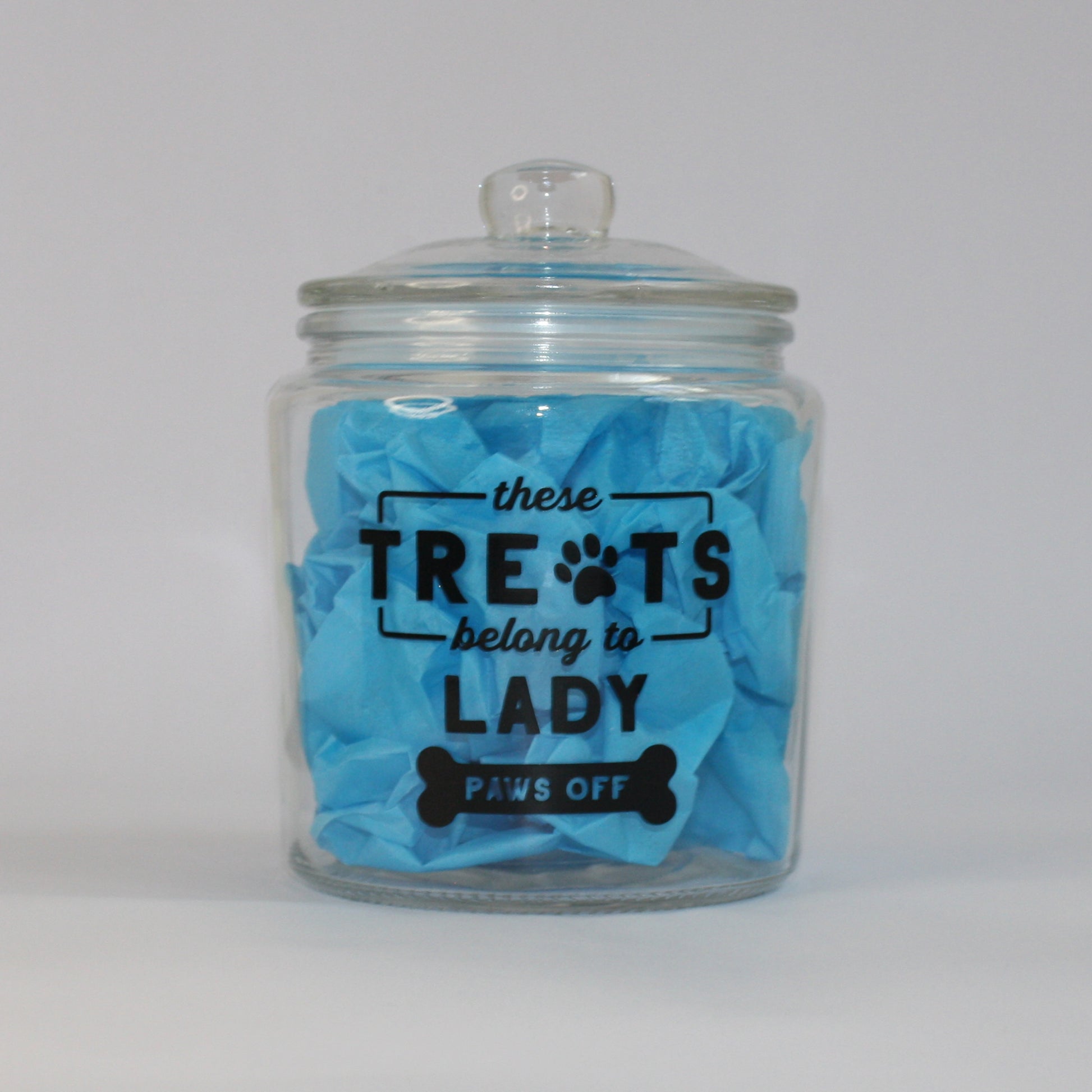 This beautiful glass treat jar is the perfect storage solution for your furry friend's snacks! With an airtight lid to keep contents fresh, it features the default phrase "These Treats Belong to" along with your pet’s name. Want custom wording? Just message us before placing your order and we’ll let you know if it’s possible.