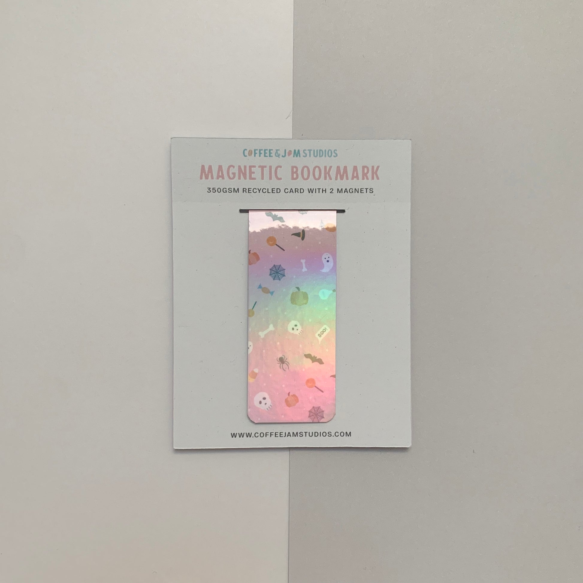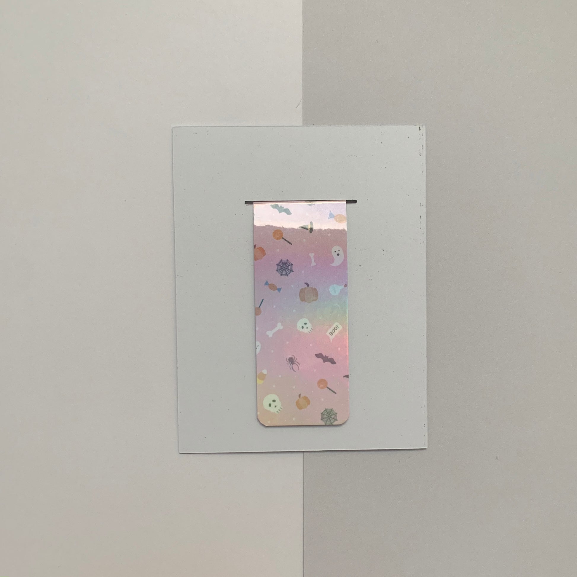 Add a touch of spooky sweetness to your reading with this Pink Halloween mini magnetic bookmark. Printed on recycled card and finished with a shimmering holographic overlay, it sparkles with every page turn while keeping your spot secure.
