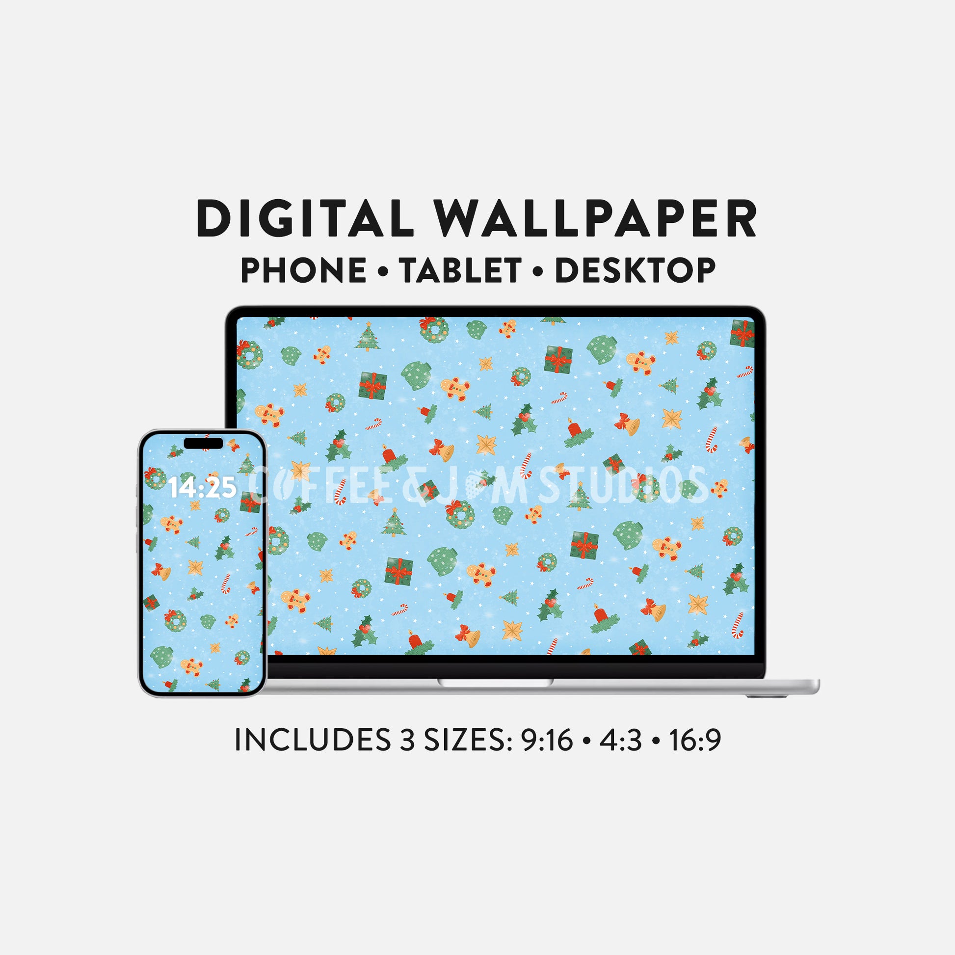 This Christmas wallpaper features adorable gingerbread cookies, candy canes, wreaths, and presents — all set against a soft snowy blue background. Perfect for your Phone, Tablet, or Desktop to bring cosy holiday vibes wherever you go.
